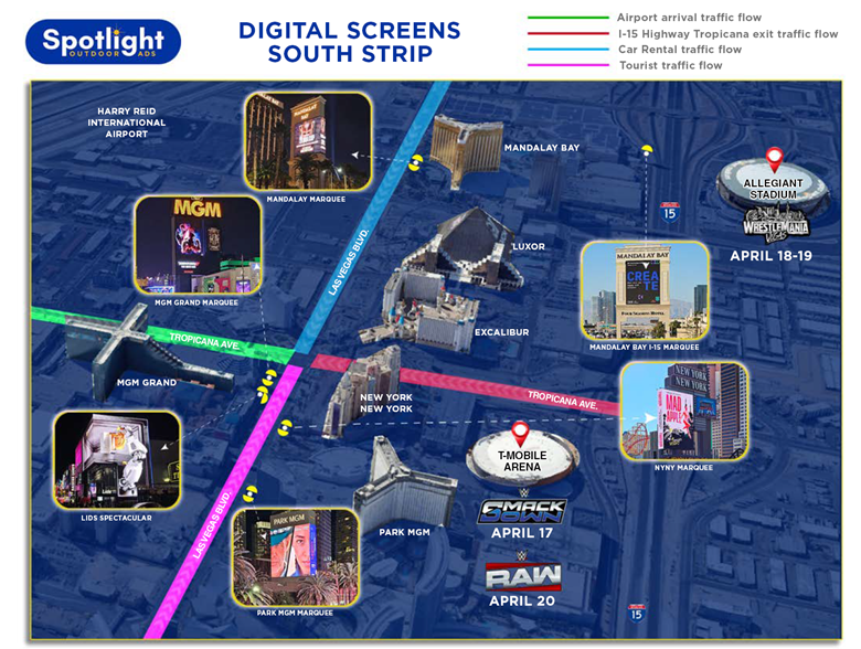 Our digital marquees sit in the most valuable real estate in Las Vegas: the Strip. During WrestleMania week, this corridor becomes a nonstop flow of fans, tourists, influencers, and media.
