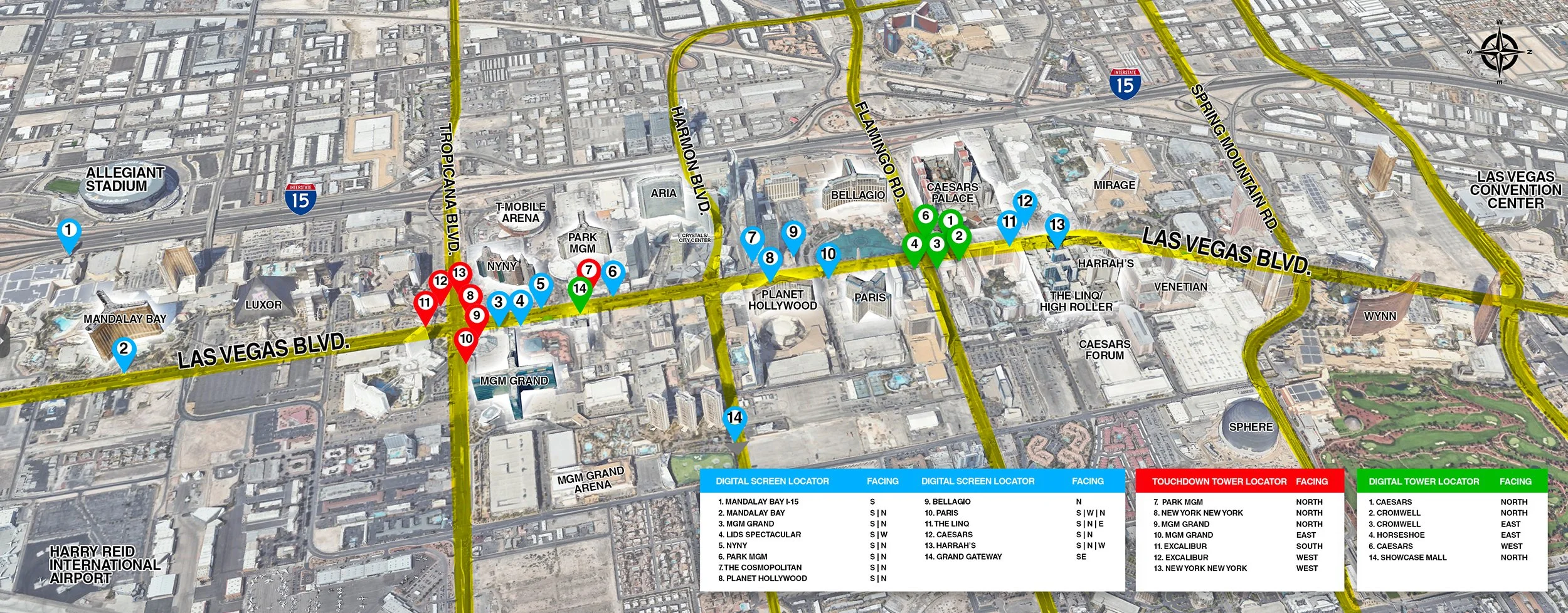 Even as the Touchdown Towers evolve into a spectacular new digital network, five of our original static towers remain available for bookings well into 2026. These 38-foot-tall placements sit at two of the most valuable intersections on the Las Vegas Strip: Las Vegas Boulevard at Tropicana Avenue and Las Vegas Boulevard at Park Avenue. Together, they face north, south, and east, positioning brands directly in the flow of nonstop Strip traffic.